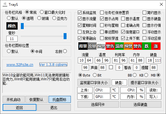 TrayS是一款非常实用的win10任务栏透明软件,软件功能强大,操作简单易用,支持任务栏透明、调色、磨砂、亚克力效果以及图标居中显示、硬件状态监测的功能,可以帮助用户对任务栏进行调整,无论是任务栏颜色,样式,透明度等设置调整,还可以对硬件的流量、温度、cpu等运行状态进行检测,能更好的处理电脑的各种小问题,有需要的小伙伴赶快下载使用吧!