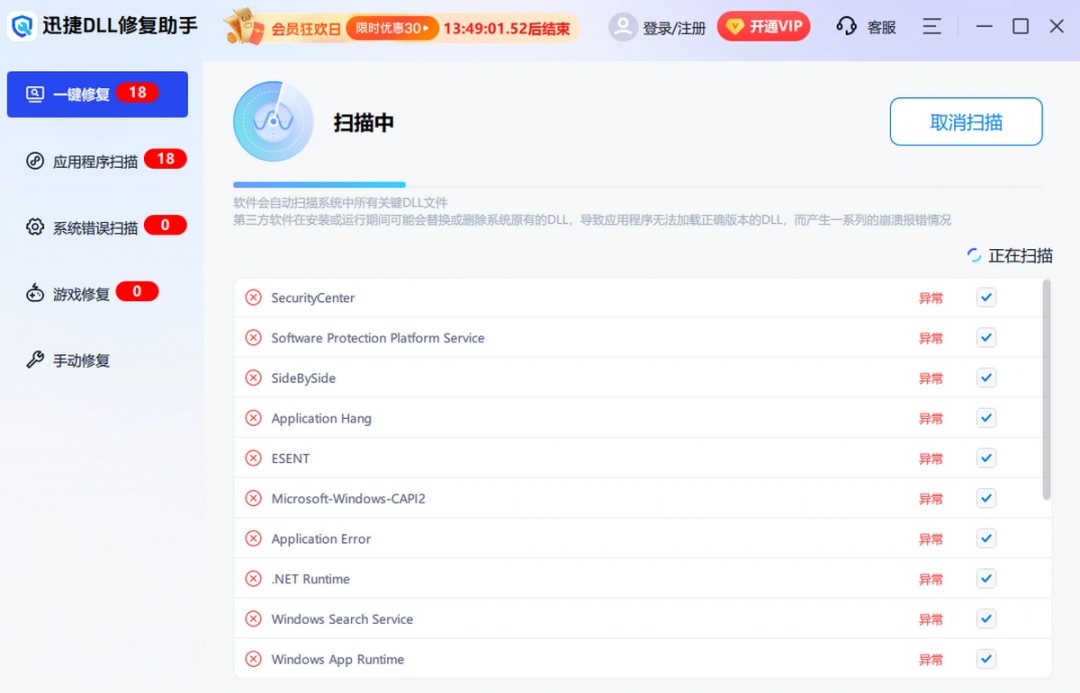 迅捷DLL修复助手是一款非常专业的DLL文件修复工具,软件功能强大,操作起来非常简单,拥有DirectX、C++、.net等运行库的下载资源,提供一键扫描并修复因DLL文件缺失而带来的画面显示异常、软件打开异常、系统崩溃提示等问题,满足各类软件的修复需求,感兴趣的小伙伴就快来下载体验一下吧!