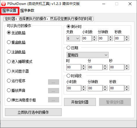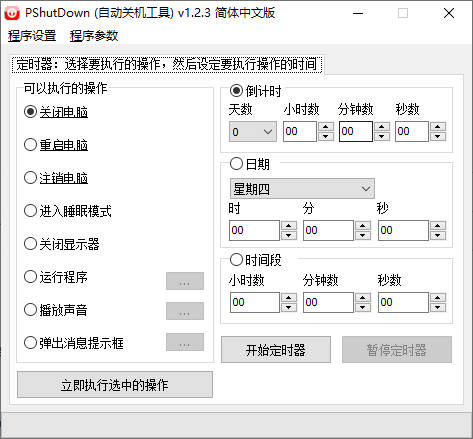 下载PShutDown是一款小巧实用的开关机工具,具备多种定时模式,包括倒计时关机、指定时间关机、循环执行等,支持关机前显示提示消息,帮助用户保存工作,同时可设置开机后自动运行指定程序,适合个人用户管理电脑使用时间,软件资源占用低,运行稳定可靠,喜欢的小伙伴千万别错过,快来下载吧!