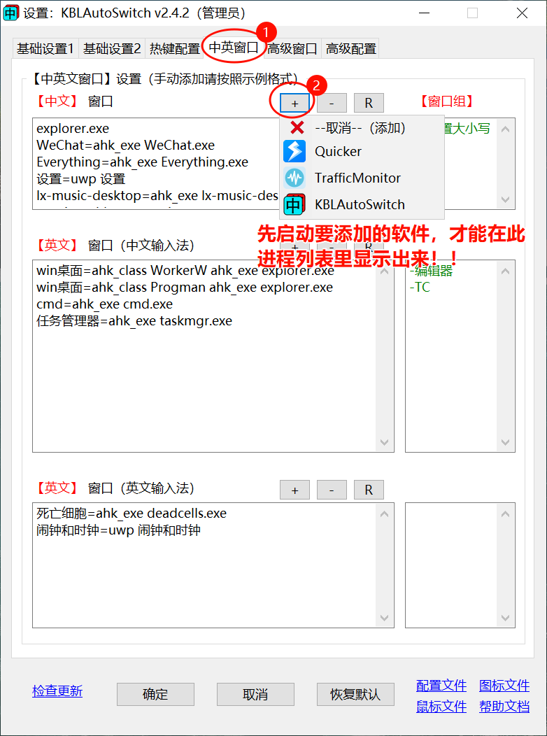 3、点击中英窗口,可以为常用软件添加自动切换中/英文功能。