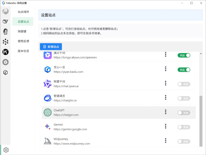 2、接着在这里找到新建站点块就可以加入一个全新的站点。