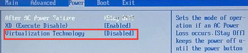 2)通过← →方向键选择【Power】选项,然后通过↑ ↓方向键选择【Virtual Technology】并按下回车。