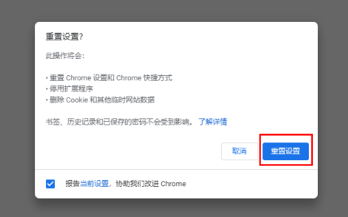5、这时会在页面上出现一个重置设置的提示窗口,直接点击【重置设置】按钮即可。(如图所示)